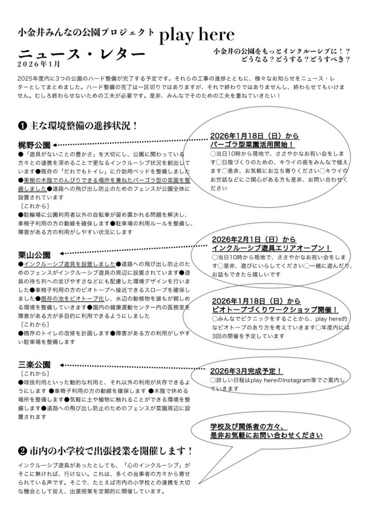 2025年度内に3つの公園のハード整備が完了する予定です。それに伴い、新しい様々な取り組みを行っていきます。下記のニュースレターにまとめておりますのでぜひ内容をご覧いただき、興味のある活動にご参加ください。お待ちしております。