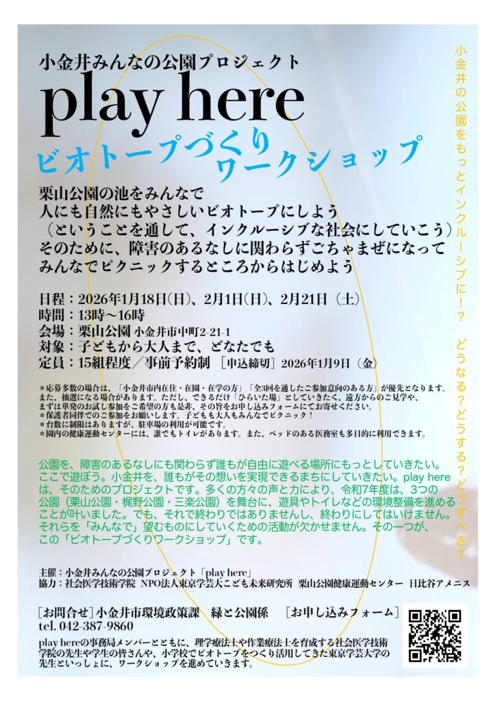小金井市では、障害のあるなしに関わらず、だれもが公園で遊ぶことができるよう、「小金井みんなの公園プロジェクトplay here」を推進しています。